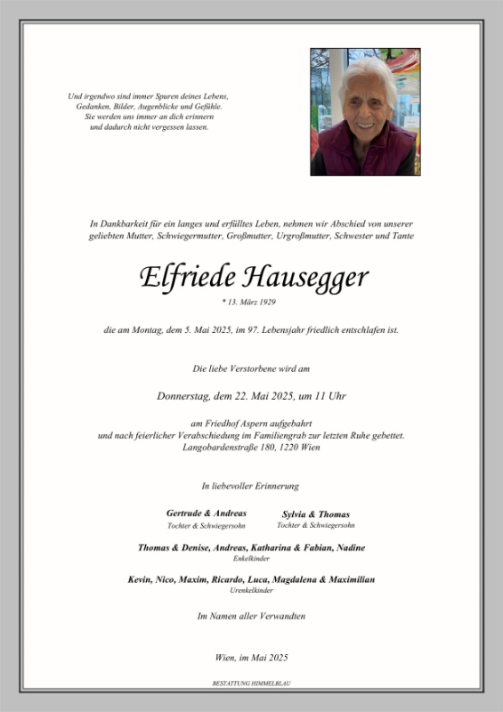 Liebe Friedl wir wünschen dir Frieden wo immer du bist, du kannst stolz sein auf dein langes Leben, in dem du vielen Menschen aufgrund deiner liebevollen Art Freue gegeben hast. Berti und Trixi
