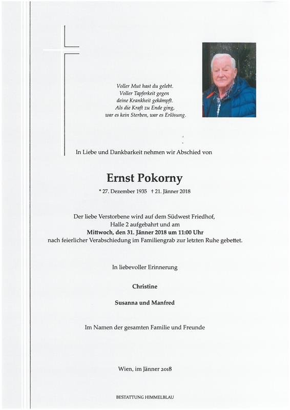 Lieber Herr Ernst ,Mein Beileid , aber mein Bruder wird am 1.2.Begraben und ihr werdet euch im Himmel sehen!Liebe Grüße an meinen Bruder Willi Lg Annemarie