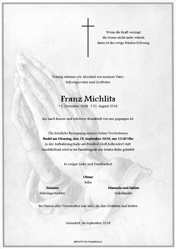 es ist schwer für uns die richtigen Worte zu finden, um Euch zu sagen, wie sehr wir mit Euch fühlen. Die Welt hat durch den Tod unseres Franz-Onkel einen äußerst willensstarken, disziplinierten aber auch interessanten und feinsinnigen Menschen verloren. Wir traueren mit euch!