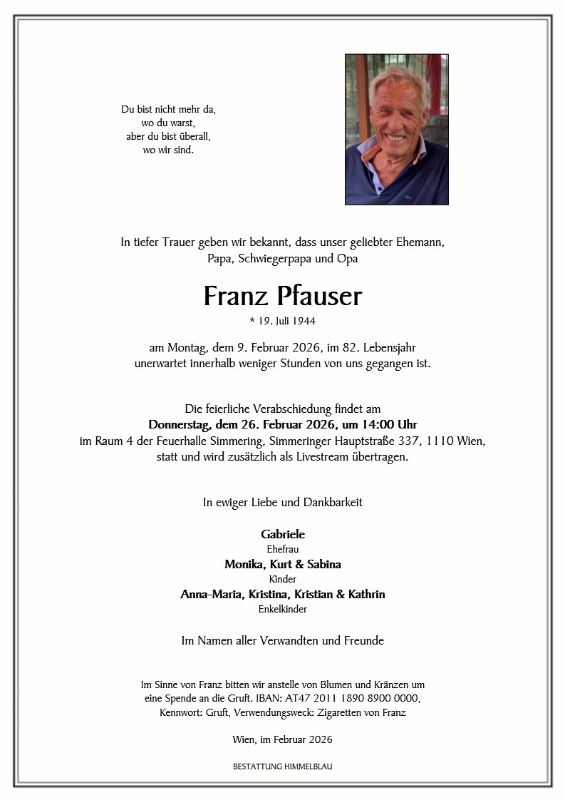 auch jetzt , nachdem die Nachricht von Franz Tod ein paar Tage her ist ,sind wir so traurig und das ein Wiedersehen nicht mehr möglich ist ,unvorstellbar.
