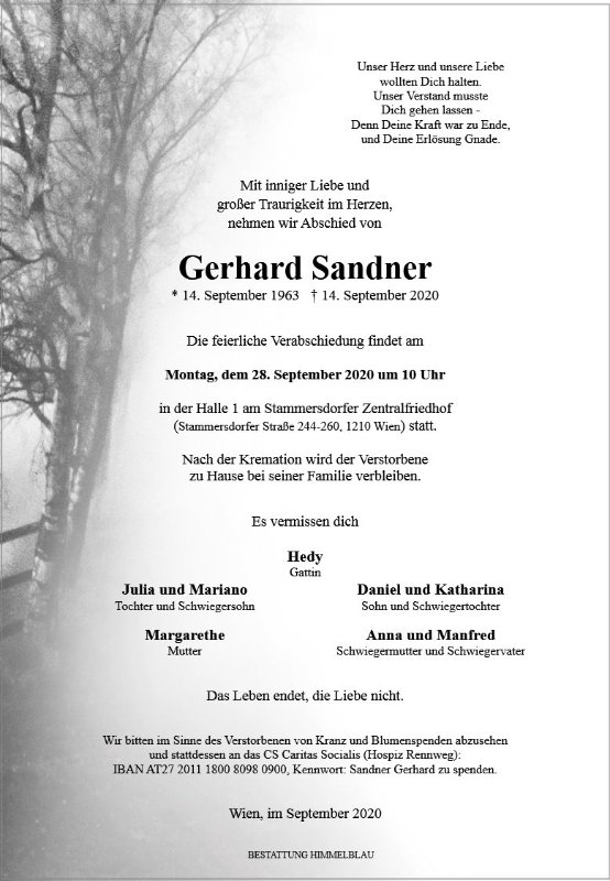 Heute muss ich mich von einem lieben Menschen und vor allem von einem lieben Freund verabschieden. Du hinterlässt eine große Lücke im Leben derer die Dich gekannt haben. Ich wünsche Deinen Lieben viel Kraft in dieser schweren Zeit.