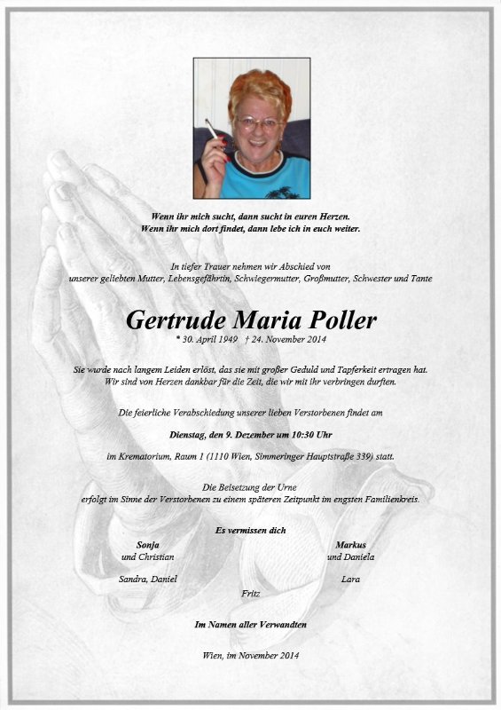 Schade finde ich, dass wir nicht noch mehr Zeit gemeinsam verbringen konnten, jedoch bin ich froh das es Ihr dort wo Sie jetzt ist besser geht.