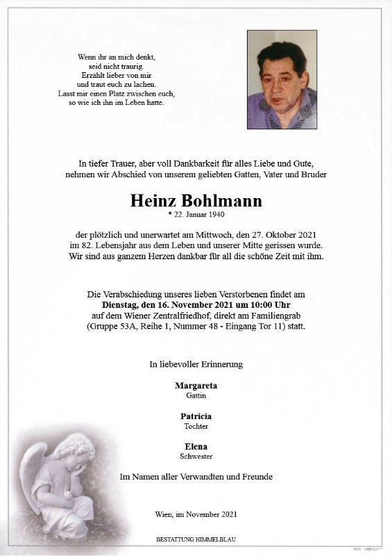 ich möchte auf diesem Weg mein aufrichtiges Beileid bekunden. Heinzi war viele Jahre auch an meiner Seite. Anfangs als Kunde, relativ schnell als Freund und zum Schluss schon mehr wie Familie. Viel und oft haben wir über seine Vergangenheit aber auch seine Gegenwart geplaudert sodass die Stunden nur so dahinflogen. Ich werde mit Ihrer Erlaubnis am Tag der Beisetzung bei Ihnen sein und verbleibe mit traurigem Herzen... Thomas Walkner