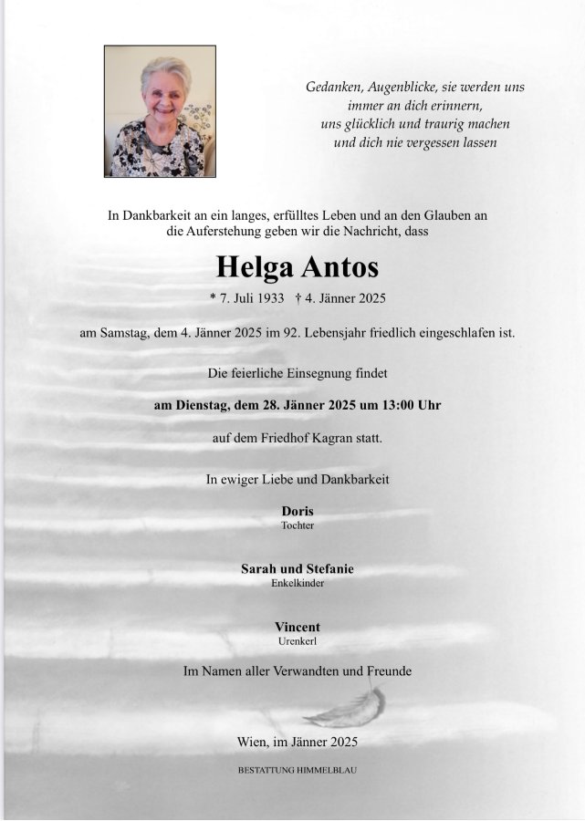 Liebe Familie Chytra, ein Dankeschön für Alles, was Ihr an Eurer Mama und Oma Helga Antos geleistet habt.Familie Prohaska