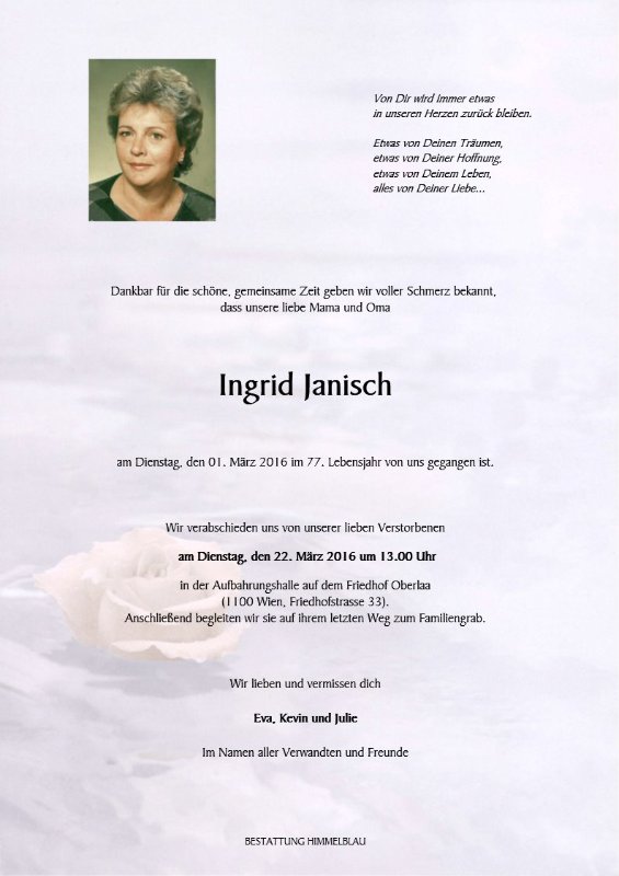 Liebe Eva!Unsere Anteilnahme und viel Kraft von uns allen.Leider ist es uns aus gesundheitlichen Gründen nicht möglich an der Beerdigung von Inge teilzunehmen.
