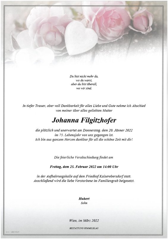 Liebe Johanna! Dort wo du jetzt bist herrscht Frieden. Wir werden die Wien-Besuche bei dir sehr vermissen. Auch deine Anrufe werden fehlen. Danke auch dafür das du mir diesen schönen Wallfahrtsort Maria Taferl empfohlen hast. Es war wunderschön dort. Als ich dort spazierte warst du in Gedanken bei mir. Auch die Gesellschaftsspiele die wir mit Nils gespielt haben werden fehlen. Die lieben Geschenke, so lieb ausgewählt, auch die Kinderbücher. Sachertorte und alles bei dir war so typisch Wienerisch. Mir wird das sehr fehlen - dieses qe²Stückchen Wien und unsere Gespräche um die Vergangenheit. Gerne wäre ich öfters gekommen, durch Corona blieben dann wenigstens die Anrufe. Wir waren Freundinnen. Du hast mir gesagt ich bin eine lustige Person. Das fand ich schön. Auch der Nils war gerne bei dir. Wir - Nils und ich werden dich sehr vermissen und die Besuche bei dir. Dank dir, kann ich dem Nils auch etwas über seinen Großvater bzw deiner Vergangenheit erzählen. Zb über den Holzgehstock oder das er Stalingrad überlebt hat. Ohne ihn gebe es die neue Generation nämlich gar nicht. Wir halten die Vergangenheit in Ehren. Ich habe eine Kerze von Maria Taferl für dich. Jessi und Nils
