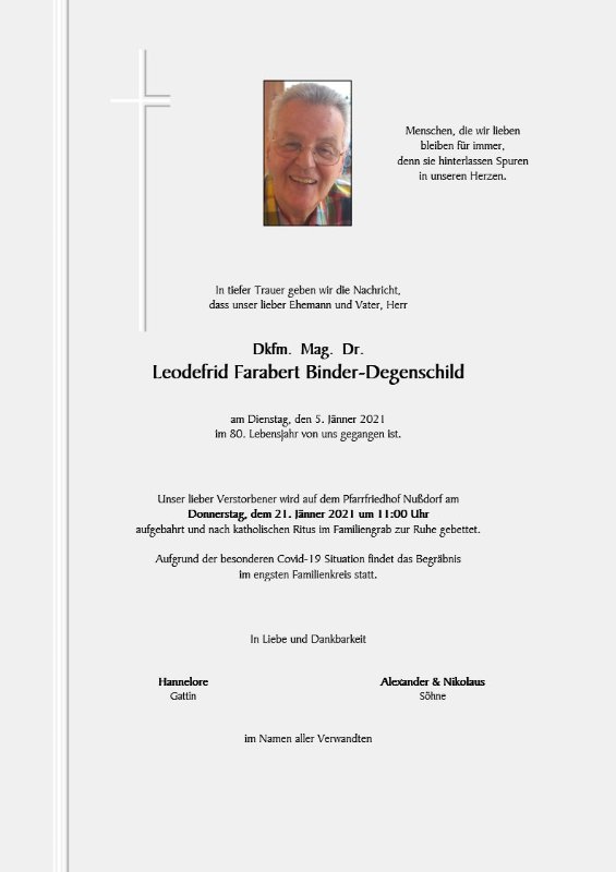 Mit Schock und Traurigkeit haben wir vom Ableben Eurer lieben Eltern erfahren. Während meiner 16 jährigen Tätigkeit im Vorstandssekretariat der Factor-Bank lernte ich Euren Vater als sehr feinen, besonnenen Gentleman kennen. Wir schätzten nicht nur sein hohes, fachliches Wissen, vielmehr aber sein humanes, großzügiges Verhalten seinen Mitarbeitern gegenüber. Es war ein reibungsloses und harmonisches Arbeiten, an das wir gerne zurückdenken. Eure liebe Mutter behalten wir ebenso als besondere, sehr starke, sehr heitere Person gerne in Erinnerung.