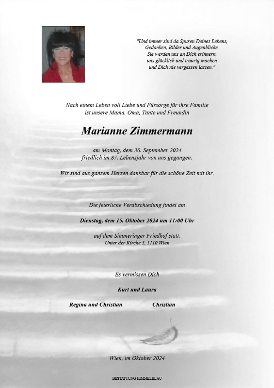 Liebe Tante Marianne!Ich werde Dich vermissen.Ruhe in Frieden bei Deinem vorausgegangenen Mann Kurt und Deiner Mutter Maria.Dein Neffe Christian