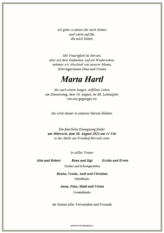 Ich möchte der gesamten Familie von Marta mein tief empfundenes Beileid zu eurem schweren Verlust mitteilen. In Gedanken bin ich bei Euch und wünsche euch viel Kraft für die kommenden Wochen.