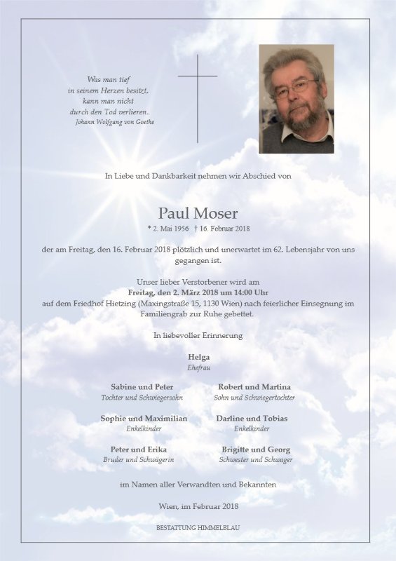 Hallo mein Schatz! Heute ist wieder einmal der 16. eines Monats, dein Sterbetag. Weihnachten steht vor der Tür und ich bin unendlich traurig, diesen Tag zum 2. Mal ohne dich verbringen zu müssen. Unsere gemeinsamen Feste waren immer voller Harmonie und schöner Erinnerungen getragen. Es wird nie wieder solche Feste mit dir geben und ich kann mich nur trösten, indem ich dich auf dem Friedhof besuche, eine Kerze anzünde und Rücksprache mit dir halte. Mache es gut wo immer du jetzt bist, frohe Weihnachten und liebe Grüße in unendlicher Liebe, Deine Helga