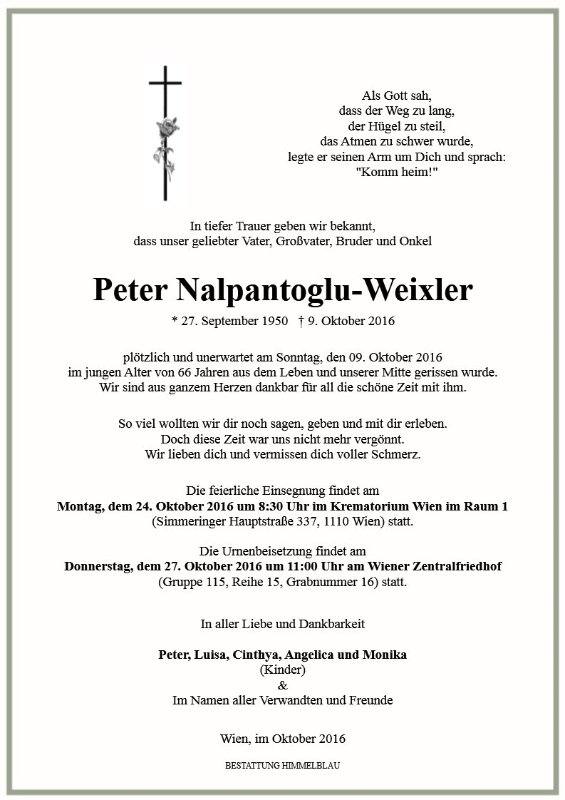 Papi es tut mir im Herzen weh ... das du nicht mehr bei uns bist ... das wir dich nicht mehr sehen oder hören können. Soviel Zeit hätten wir noch haben könne, so viel Zeit die wir nicht genutzt haben. Du warst ein liebevoller Mensch ein Opa von dem man nur träumen kann. Als deine Tochter vielleicht nicht im Blut aber im Herzen werde ich immer stolz sein auf dich. Alejandro und Antonio hatten echt Glück dich als Opa zu haben. Wir werden dich sooo vermissen, niemand wird diese Lücke jemals fühlen können die jetzt bleibt. Danke Papi für die schönen Momente und Erinnerungen. Du wirst nie wirklich weg sein du wirst immer in unseren Herzen bleiben. Wir lieben dich