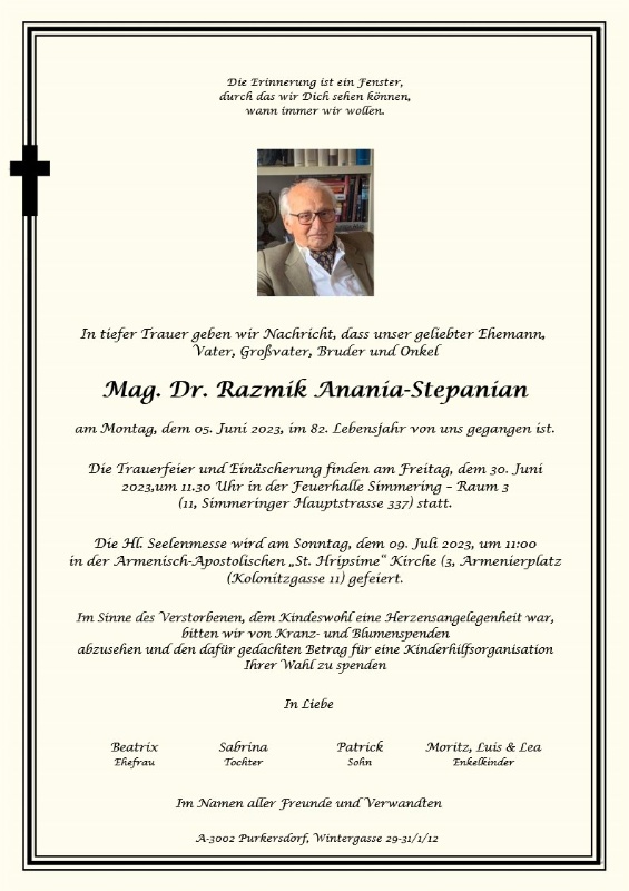 Razmik & I began our studies in Austria at more or less the same time. We both found our partners here & married at more or less the same time. In our younger days, before you & Razmik travelled to Iran, the four of us spent quite a lot of time together. Our fond memories of those carefree days are still with us. We went to parties & picnics together, & Razmik was always a positive presence at those gatherings, with his humour & laughter. Above all, he was always a sincere friend. He may no longer be here with us, but our sweet memories of our friendship will stay with us for a long time. Goodbye, dear friend, and may flights of angels sing thee to thy rest!