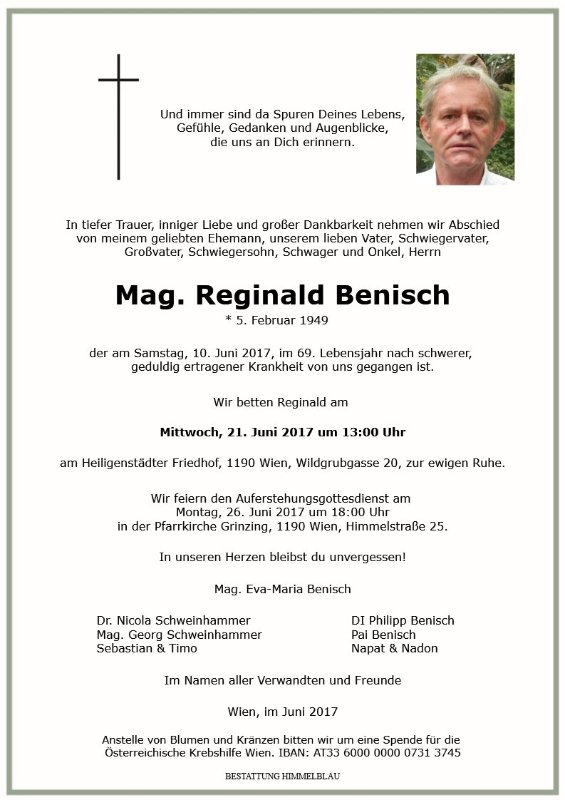 Nachdem du schon immer gern gereist bist, sage ich nicht „leb' wohl“, sondern „gute Reise Papa“ und hoffe, dass du immer spürst, wie sehr ich dich liebe.