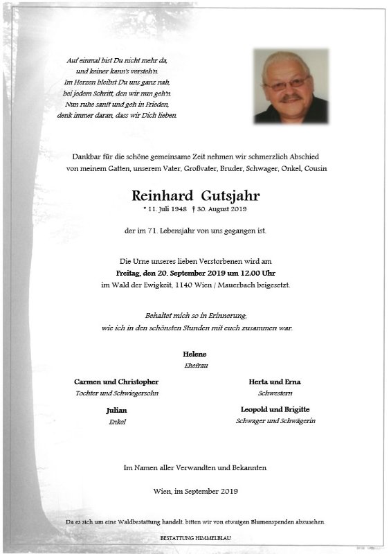 Lieber Onkel, du warst die letzten Jahre für mich der Halt und hast mich unterstützt bei meinen Unternehmungen und hast mich immer wieder aufgefangen. Nach dem Tod meines Vaters warst du immer für mich da. Ich habe vor 1 1/2 Wochen meine Prüfung bestanden die ich dir widmete. Warum müsstest du nur so früh gehen, aber in meinem Herzen wirst du immer bleiben, der Platz im Herzen ist für dich, Papa und Oma reserviert. Ich werde dich immer und ewig in Erinnerung behalten! Lieber Onkel Good Bye! Dein Neffe Thomas