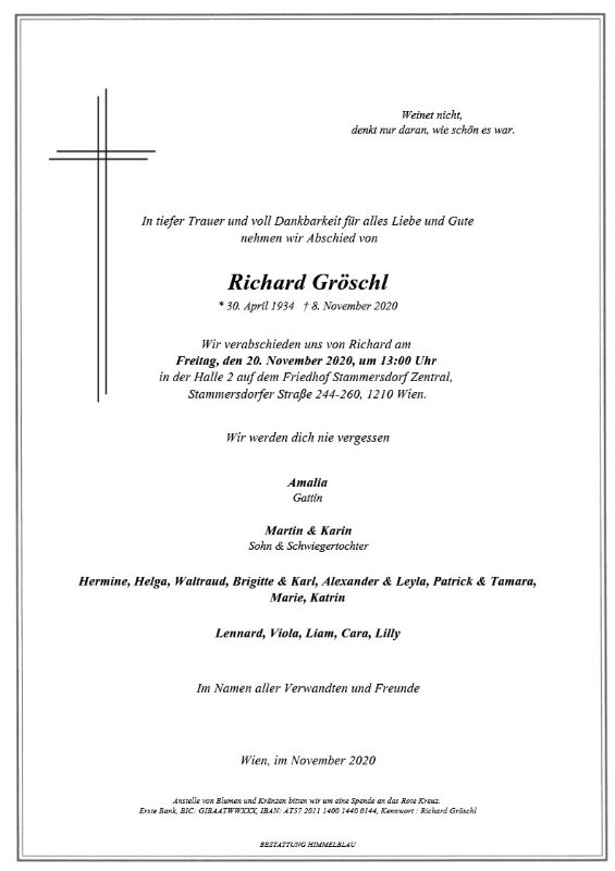 Danke für die wunderbare Zeit mit dir, die unterhaltsamen Stunden und die gute Küche. Ich / wir denken an dich!. Was man tief in seinem Herzen besitzt, kann man durch den Tod nicht verlieren.