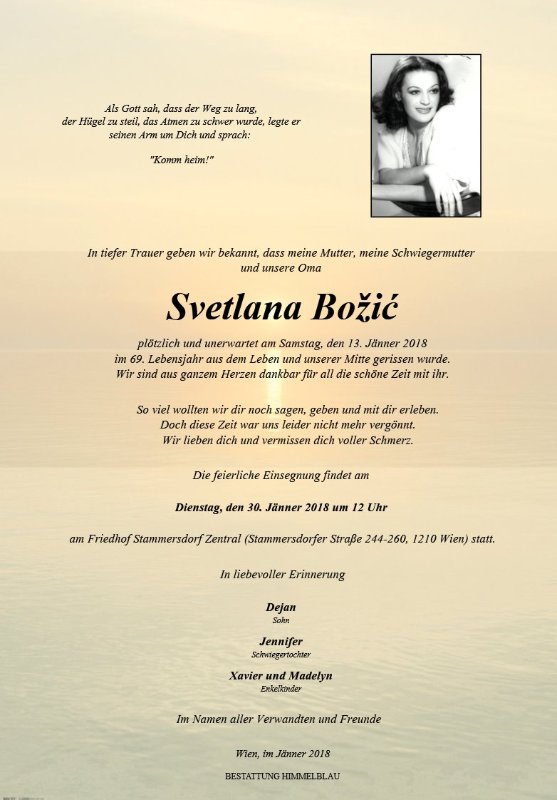 Na žalost, nakon nekoliko meseci uzaludnog pokušavanja da te nadjem, naidjoh na tvoju umrlicu na internetu... Nismo stigle ni da se pozdravimo ni da te još jednom zagrlim i ispratim. Ostaće večna tuga za tobom i sećanje na sve naše razgovore, smeh i uzajamnu ljubav.